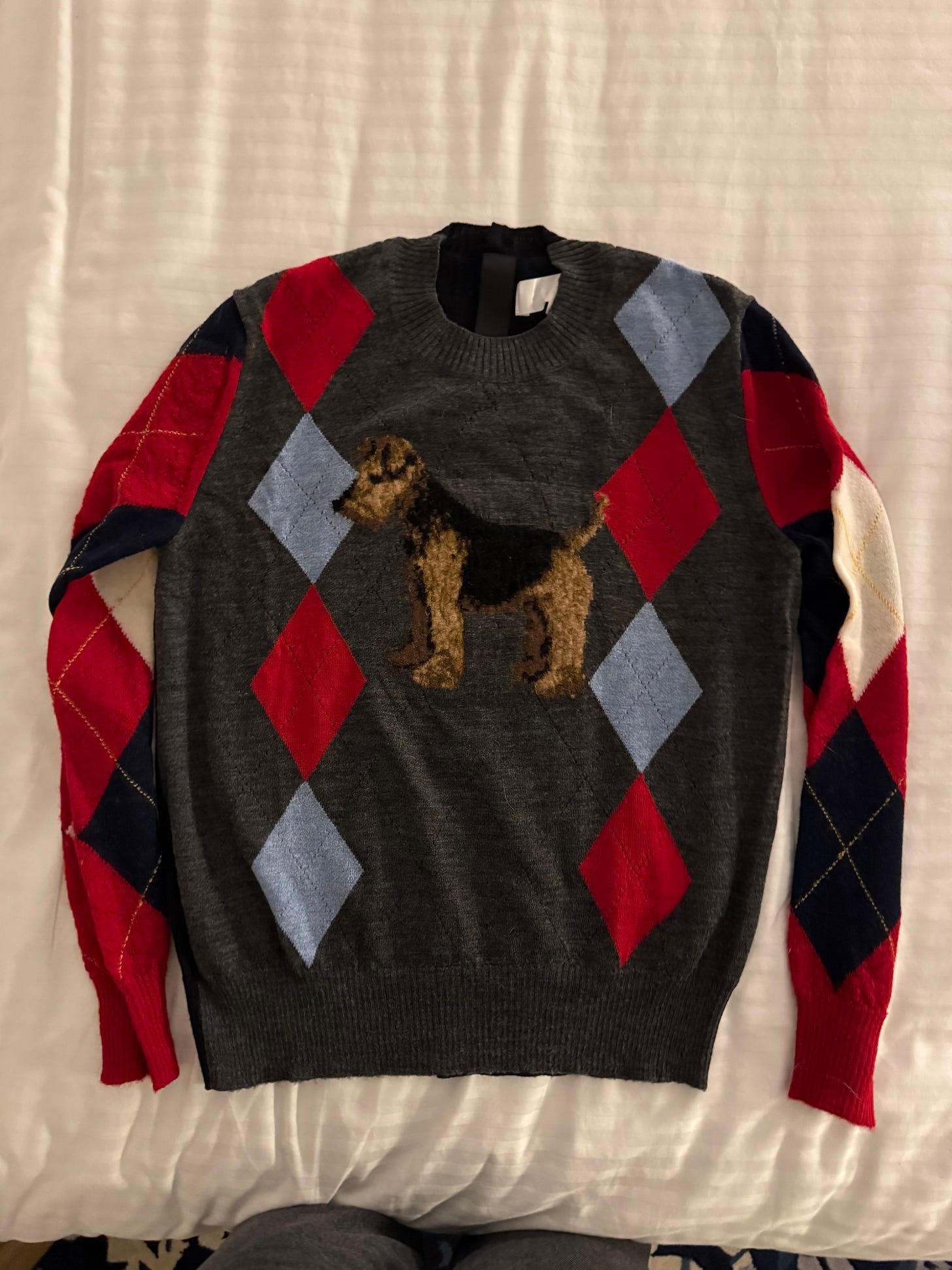 Then I added a black skirt, because maybe I’d wear a sweater and black skirt and that would be a little more see-you-at-the-protest than my usual book event outfit. Or maybe it wouldn’t be. I added a different sweater—okay, two more sweaters, because I couldn’t settle on one. This cutie is made by Tao/Comme des Garcons and I love it, but what if there are dog haters in the audience? Need another option.